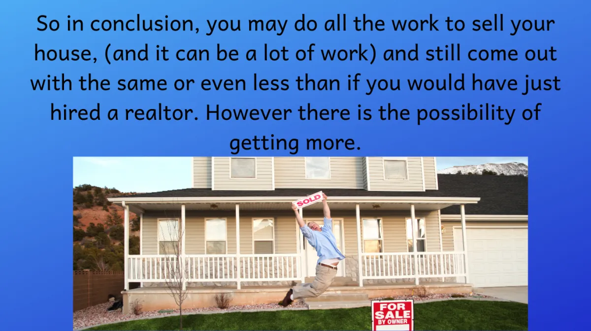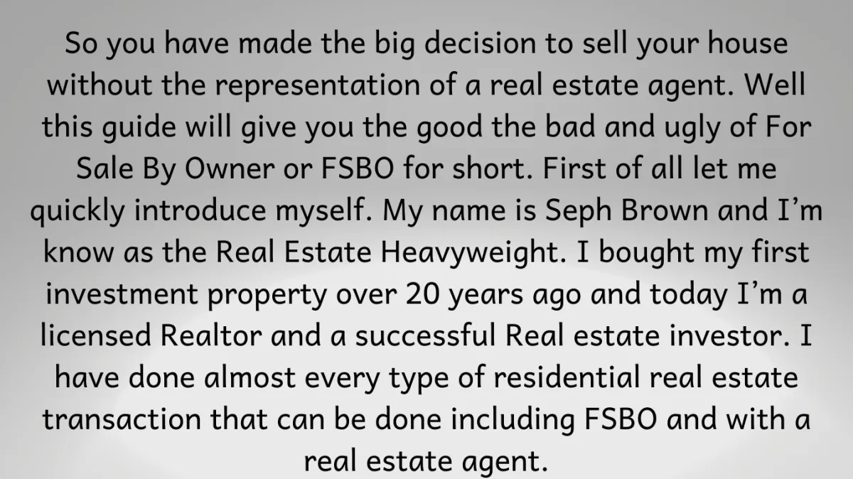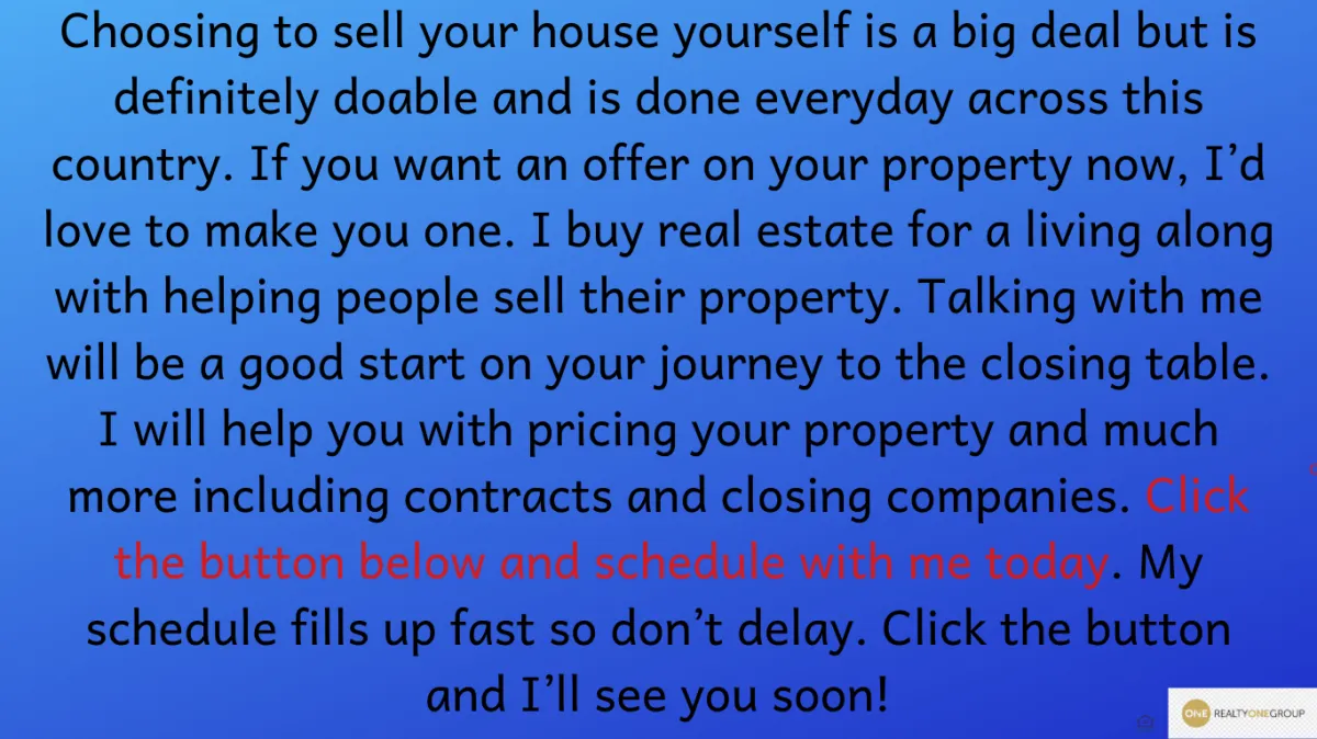 Please enjoy reading this book that I prepared for bold and courageous people such as yourself! The tips outlined in this book are simple and effective and will give you the greatest chance to succeed in selling your property without a realtor, faster and for more money. Remember I'm here to help! My strategy session scheduling button is strategically located throughout if you decide to pick my brain. Good luck and happy buyer hunting!